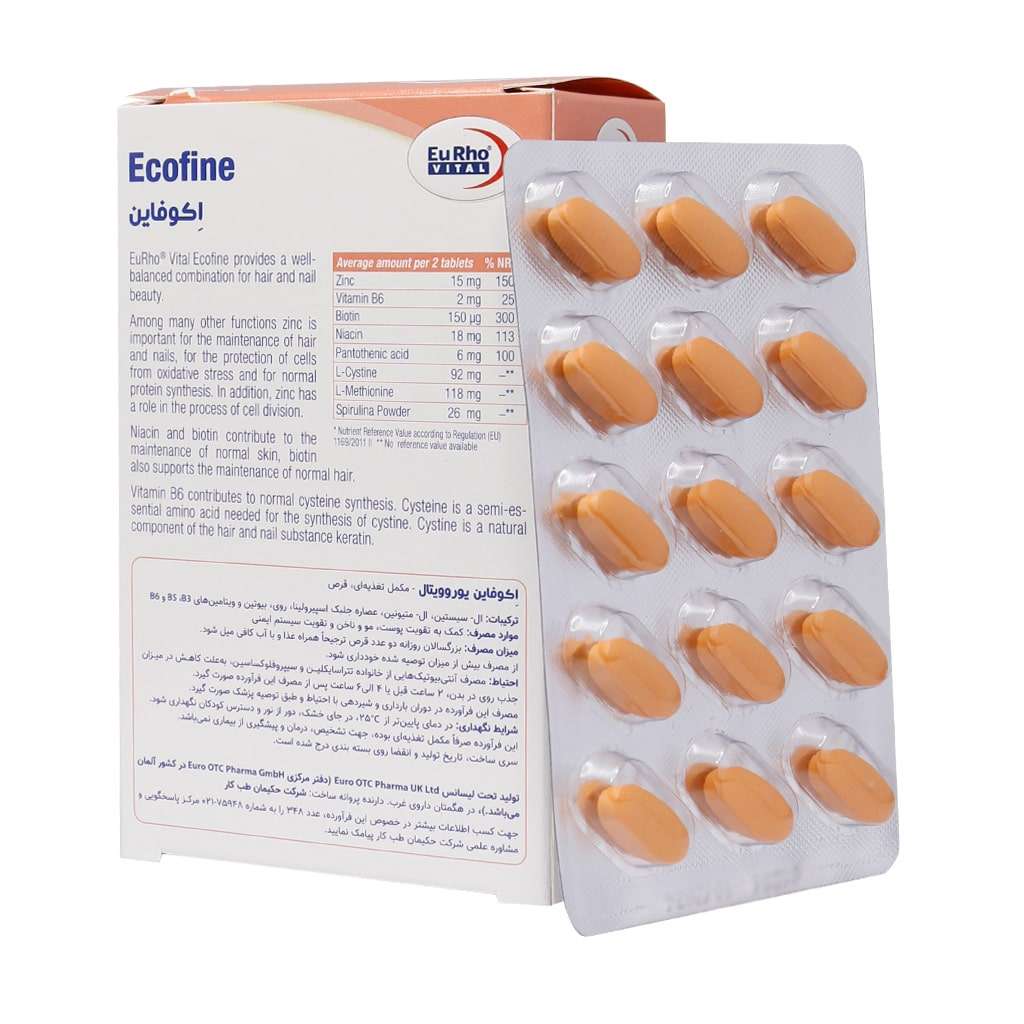 قرص اکوفاین یوروویتال تامین کننده ترکیبی کامل و متعادل از مواد لازم جهت حفظ سلامت و زیبایی مو و پوست است. روی به کار رفته در این مکمل دارای تاثیرات مفید گوناگون در بدن است. این ترکیب نقش مهمی در حفظ سلامت مو و ناخنها دارد. به طور مثال جهت حفظ سلولها در برابر استرس اکسیداتیو و سنتز پروتئین مورد نیاز است و دیگر آن که در روند تقسیم سلولی حائز اهمیت است. نیاسین و بیوتین به کار رفته در قرص تقویت مو معرفی شده نیز در حفظ سلامت پوست و موهایی سالم و شاداب نقش دارند. ویتامین b6 قرص Ecofine یوروویتال در سنتز طبیعی سیستئین موثر است. سیستئین نیز یک نوع اسید آمینه نیمه ضروری در بدن است که یکی از اجزای طبیعی تشکیل دهنده ساختار مو و کراتین ناخن محسوب میشود.